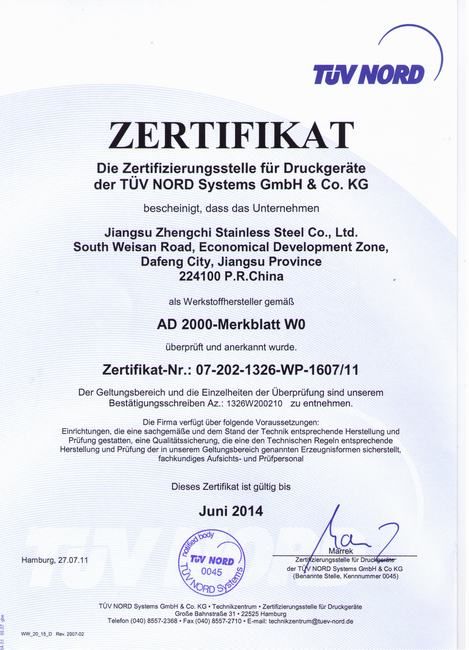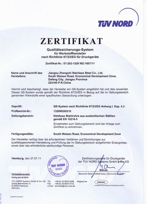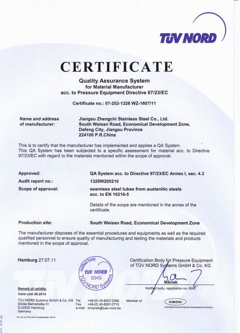 江苏正驰不锈钢有限公司通过欧盟PED认证