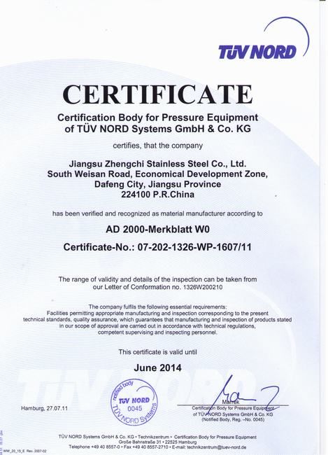 江苏正驰不锈钢有限公司通过欧盟PED认证